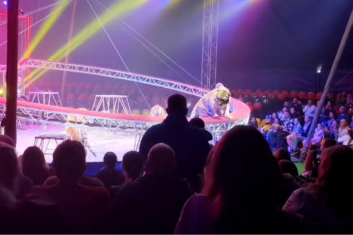 Тигр выпрыгнул из манежа к зрителям в ростовском цирке: видеоСетка, защищающая зал, упала
